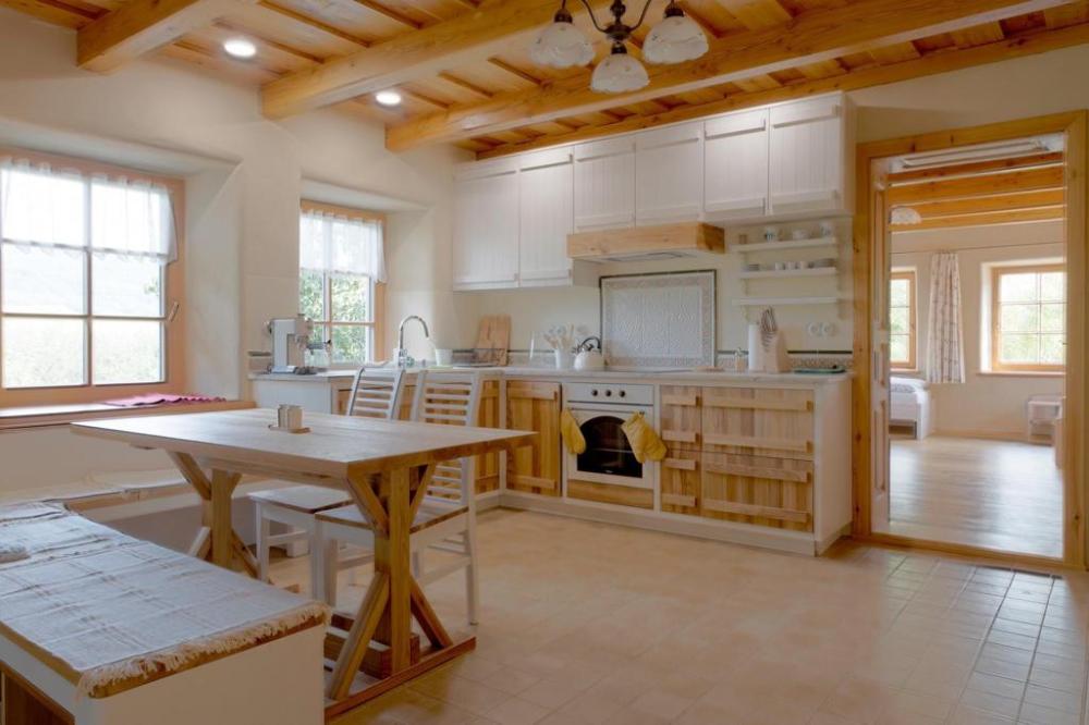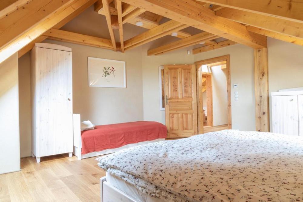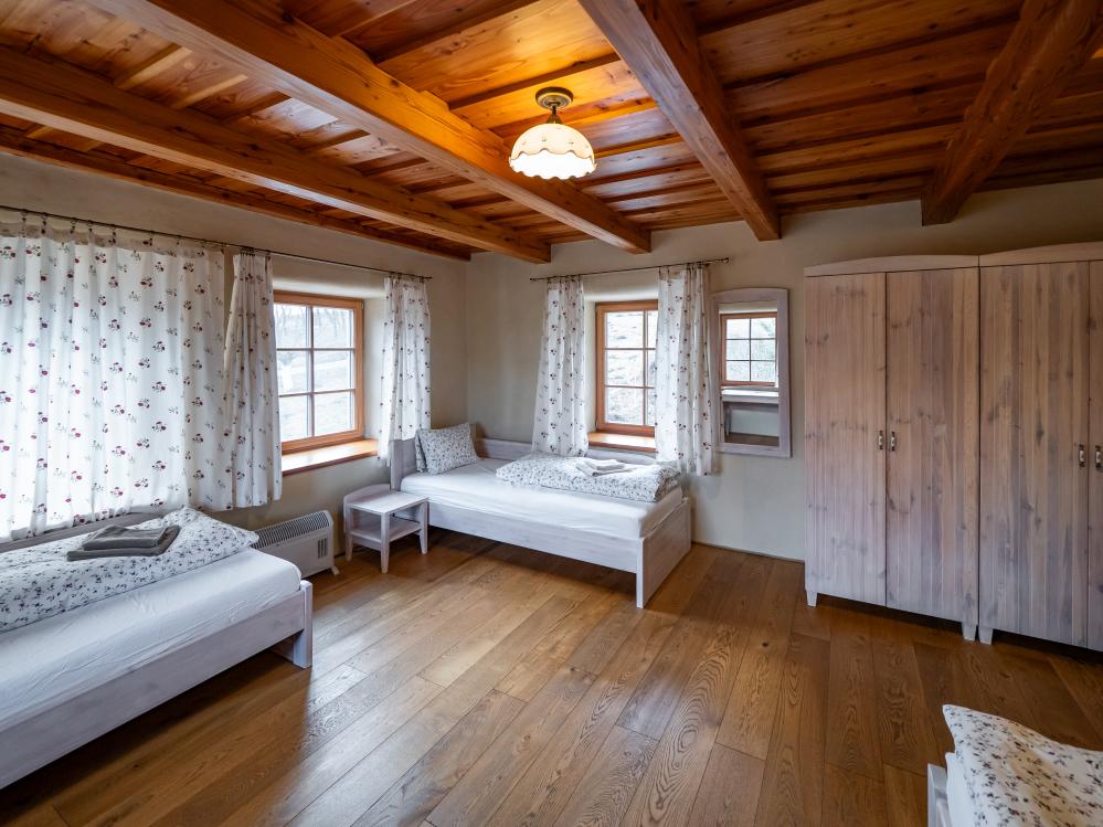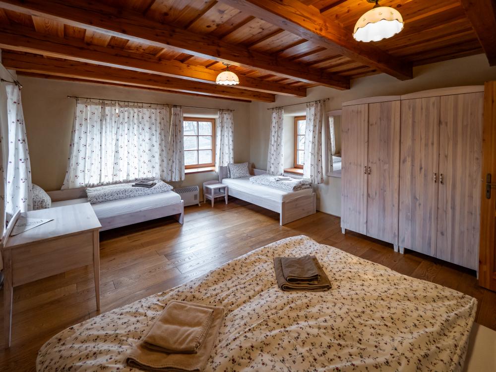 Chalupa Kaška stands as our premier accommodation, boasting five elegantly appointed bedrooms,four modern bathrooms, and a spacious dayroom designed for ultimate comfort and relaxation. Thisexpansive retreat is perfect for those seeking a blend of luxury and homely charm. The ground floor welcomes you with a fully equipped kitchen, featuring a cozy dining table, and flowsinto a comfortable living room adorned with a spacious sofa, creating the perfect setting for relaxationand socializing. Two modern bathrooms, complete with toilets and showers, ensure convenience andprivacy. The kitchen boasts a full suite of appliances including a refrigerator, freezer, stove, microwave,coffee maker, and oven, catering to all your culinary needs. Additionally, the ground floor hosts thelargest bedroom, offering a welcoming double bed and two single beds, promising a restful night's sleepfor all. Nestled in the cozy attic, discover four charming rooms, each with its own unique setup: two four-bedrooms featuring a double bed and a single with a pull-out option, a three-bed room with a double anda single bed, and a romantic two-bed room with a double bed. Complementing these inviting spacesare two well-appointed bathrooms with toilets and showers, ensuring comfort and convenience. The highlight of the attic is a versatile common room, bathed in natural light from a large window,creating an ideal ambiance for yoga, pilates, meditation, or dance sessions, comfortablyaccommodating 10-12 people. For those seeking a playful break, a ping-pong table is also available,promising fun and entertainment for guests of all ages. This attic is designed to cater to both yourrestful and recreational needs. Just steps outside the cottage, guests are welcomed by a delightfulcovered terrace, featuring two large tables perfect for outdoor dining or simply enjoying the fresh air.Adjacent to Chalupa Kaška, a whimsical children's playground awaits, offering endless fun andadventure for our younger guests in a safe and enchanting environment.