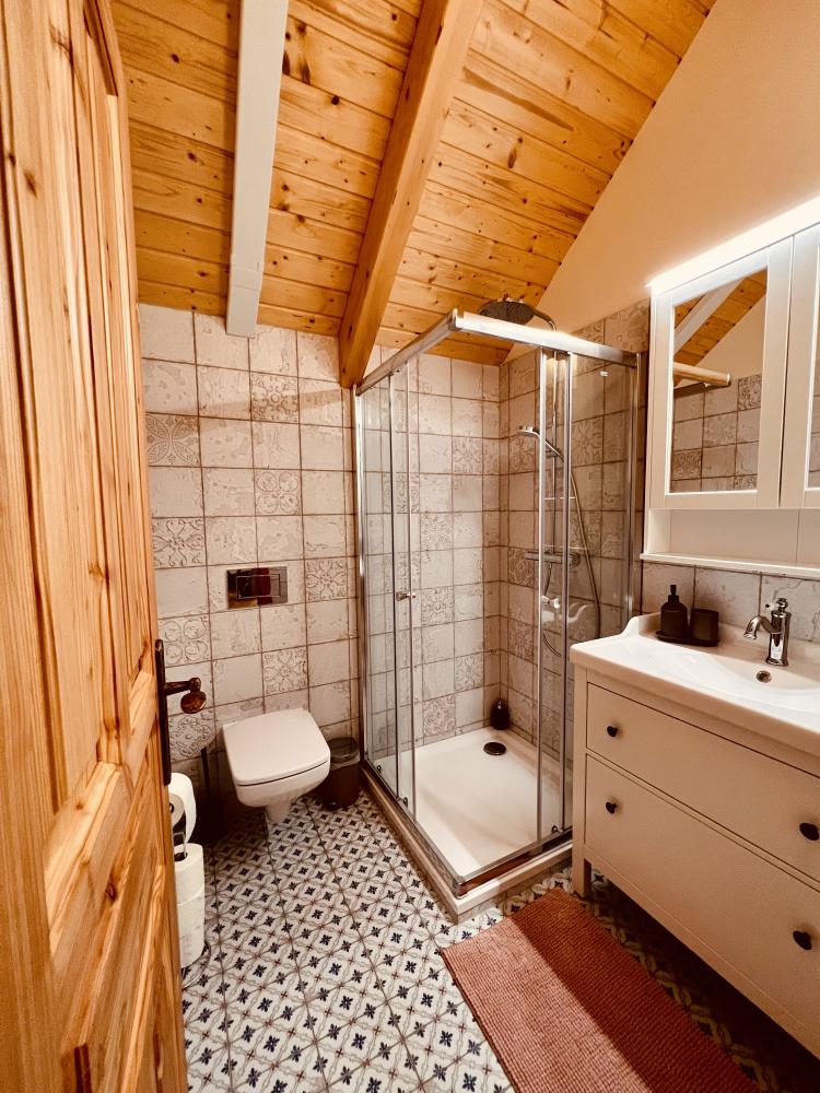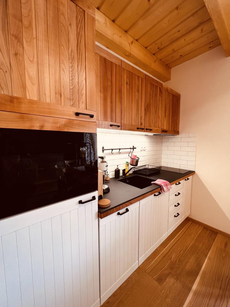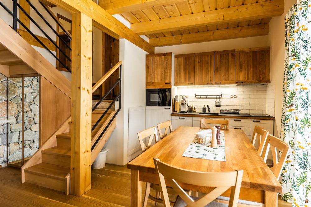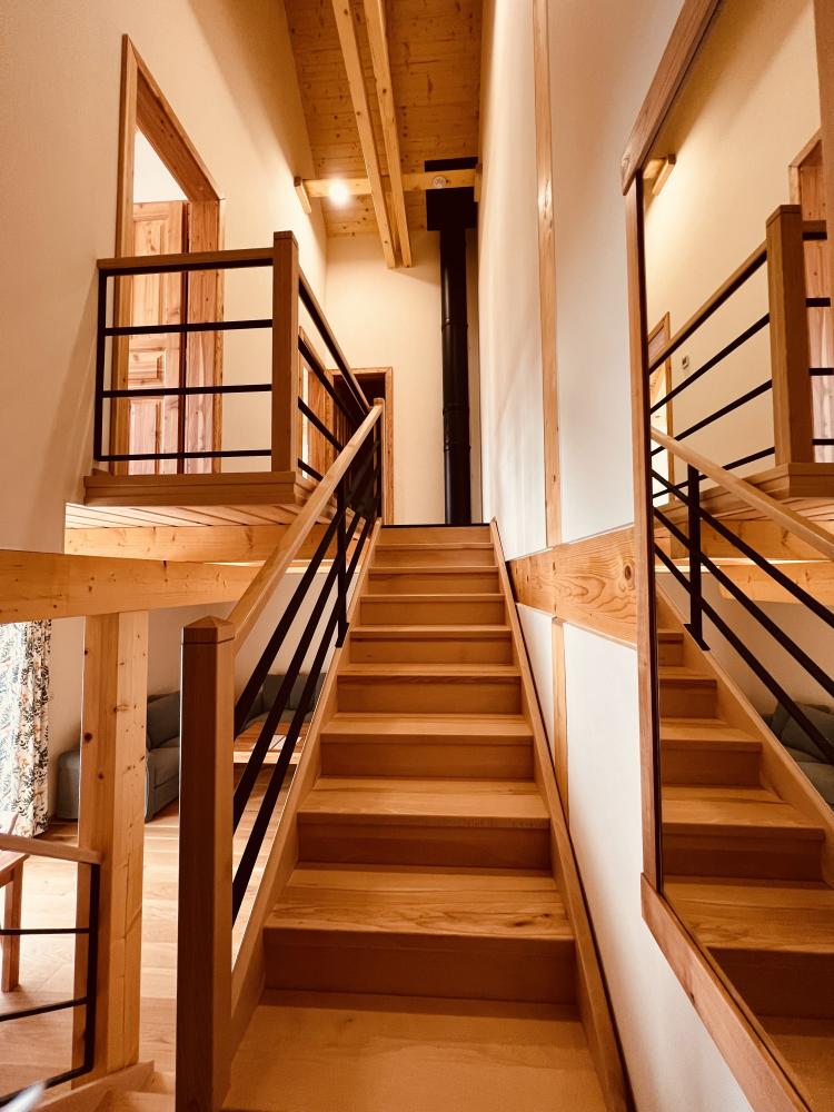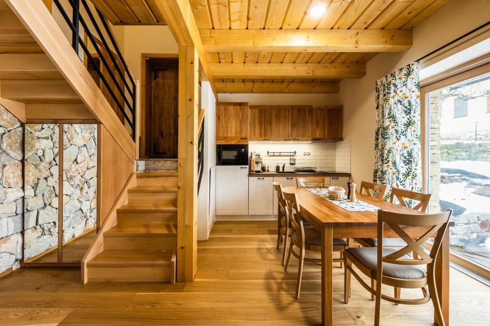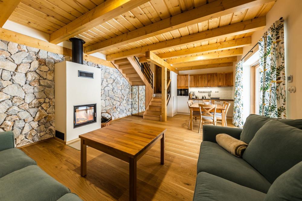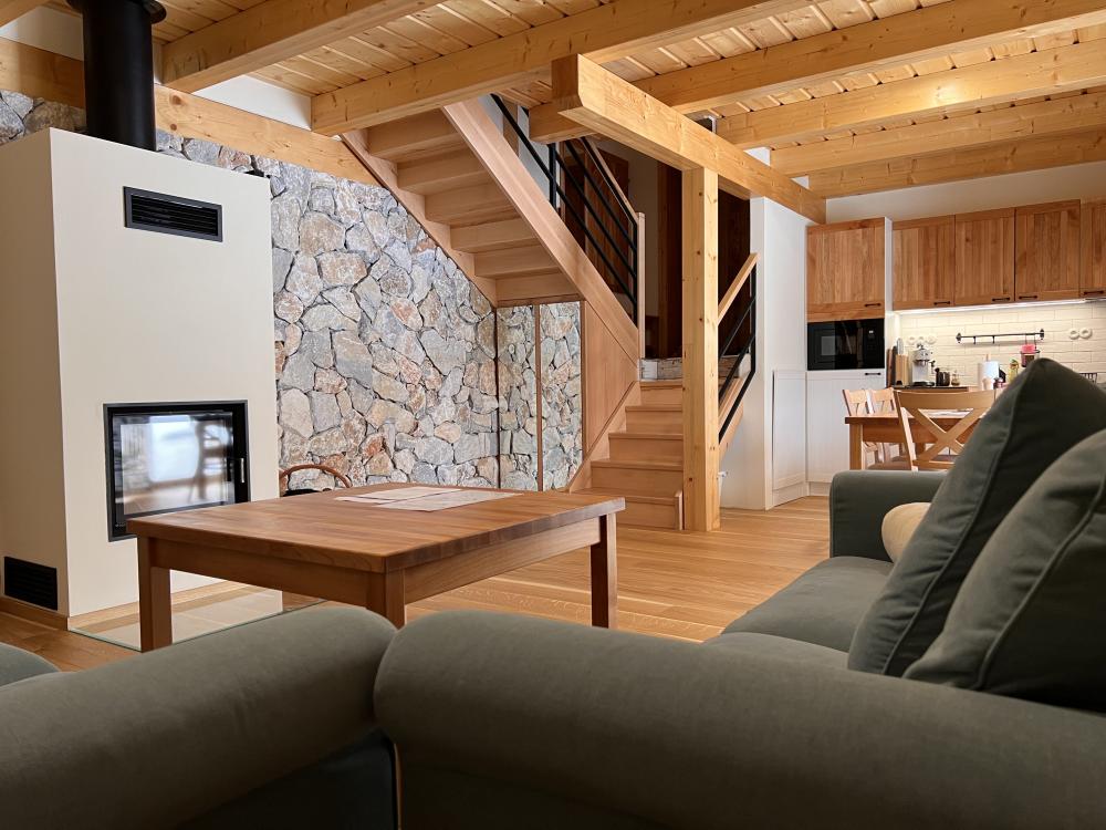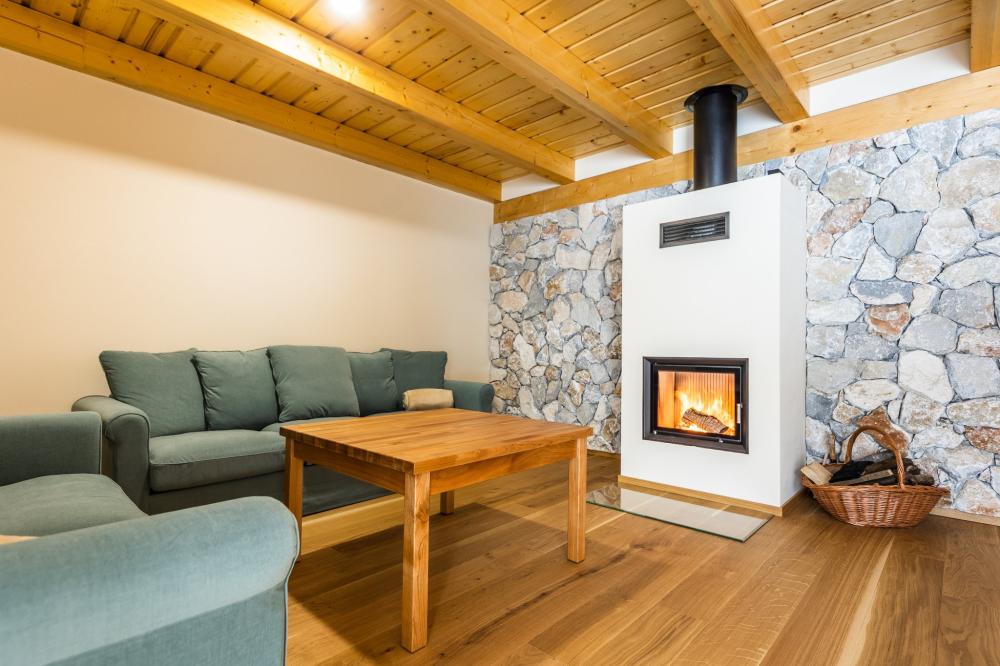 Apartments Pod Lipou (Apartment under Linden tree) and Apartmen pri Jabloni (Apartment by theApple tree) are located in the fully renowated old stone barn surrounded by hundred years old lindentree from one side and apple orchard with playground from the other side. Apartment have separateentrances and are identical with mirror facing position.On the ground floor, each apartment features a kitchenette with a living room and fireplace. Thekitchenette is equipped with a small stove, coffee machine, microwave, refrigerator and kettle. In theliving room, there is a big sofa with full size extra bed. Each aparment has private terrace with seatingand gas BBC grill which is accessible from the living-room.On the first floor, each apartment has a bathroom and two bedrooms.One bedroom has a queen (Euro king) size bed and the second bedroom has two single beds.