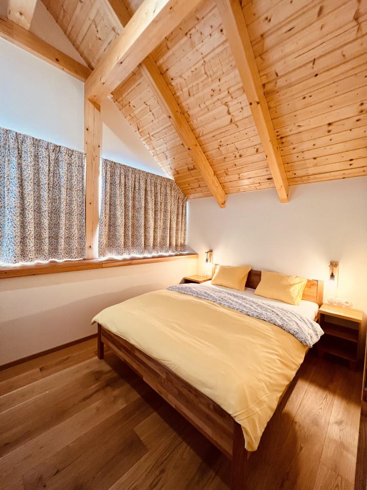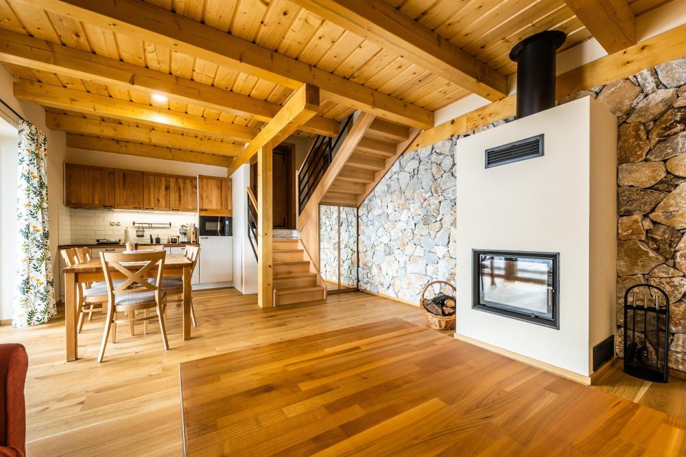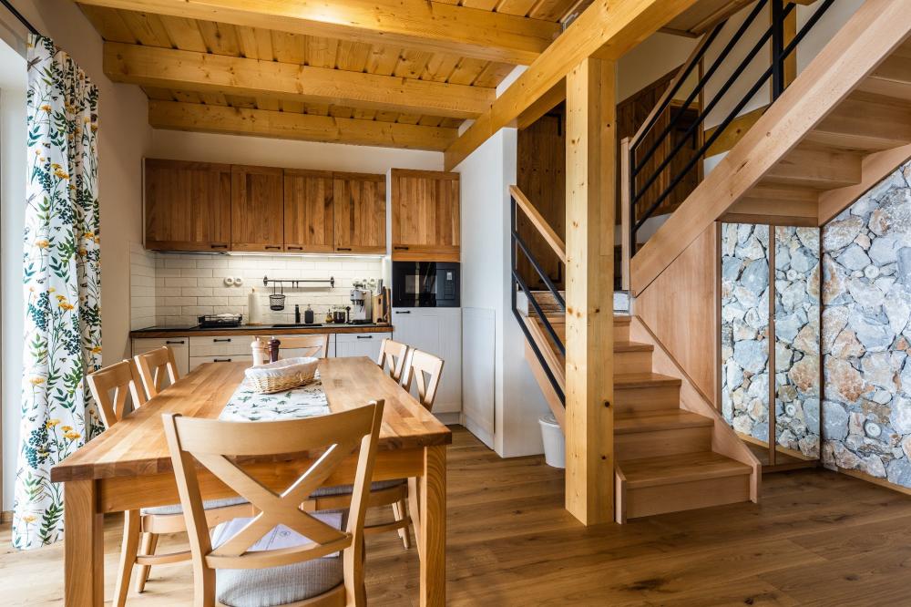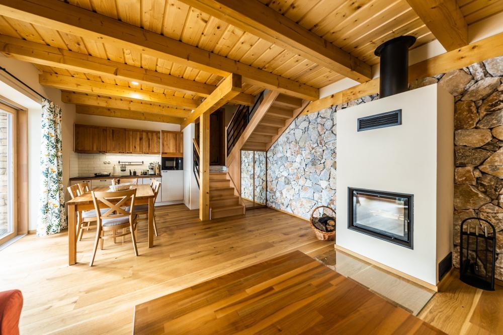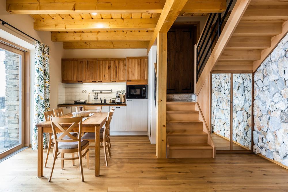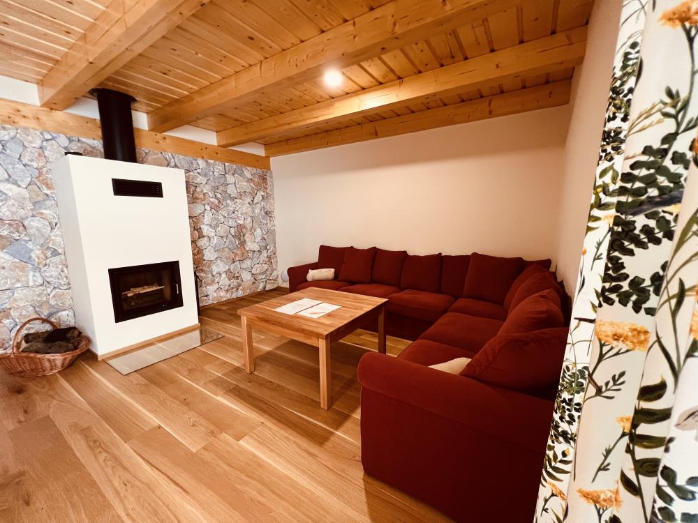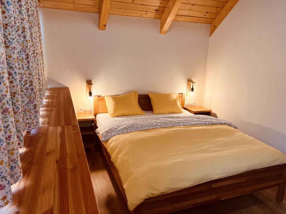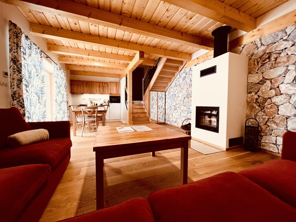 Na prízemí sa nachádza kuchynka s obývacou izbou. Vybavenie kuchyne apartmánu pozostáva z dvojplatničky, kávovaru, mikrovlnky, chladničky, hriankovača a remosky. V obývacej izbe je veľký rohový gauč s krbom. Časť gauča je možné rozložiť, v prípade potreby sa tam vyspia 2 osoby. Z obývačky viete vyjsť na terasu s grilom a výhľadom na jazero a ovocný sad, pred apartmánom si môžete oddýchnuť na sedákoch priamo pod korunou prastarej lipy. Dve 2-lôžkové spálne (1x manželská posteľ, 1x dve samostatné lôžka) a kúpeľňa sa nachádzajú na poschodí.